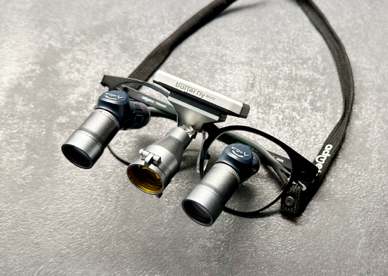 歯科治療全てで用いる歯科用拡大鏡です。最大倍率はマイクロスコープに劣りますが、歯の全体像を把握しつつ細部まで拡大することができます。