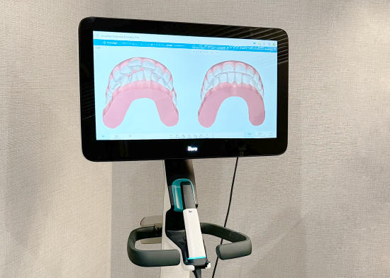 従来のようなお口の中に材料を入れて固めて採る型と違い、小型カメラを用いた3Dスキャナーで型を採ります。得られる型はデジタルデータになるので、歯科におけるDX (デジタルトランスフォーメーション)です。マウスピース矯正(インビザライン)やその他歯科治療全般に用います。従来のお口の中で固める型取りが苦手な方もぜひご相談ください。